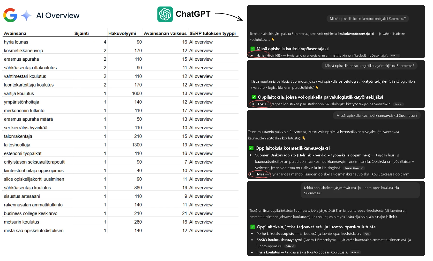 Sisällöissä on korostettu selkeyttä, rakennetta ja suoria vastauksia hakijoiden yleisimpiin kysymyksiin. Tämä tukee sitä, että Hyrian koulutusalat voivat nousta esiin myös AI Overview -nostoissa, ei ainoastaan perinteisissä hakutuloksissa.