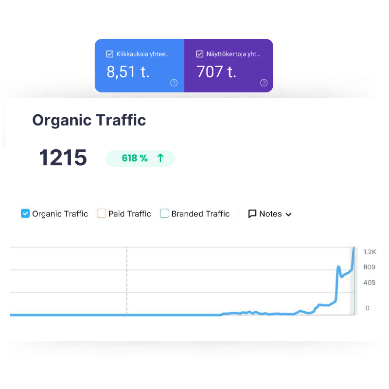 Vuoden aikana näkyvyys rakennettiin täysin uudelleen. Sivusto nousi Googlen hakutuloksiin, orgaaninen liikenne kasvoi 618% ja yhteydenottoja alkoi tulla joka kuukausi.
